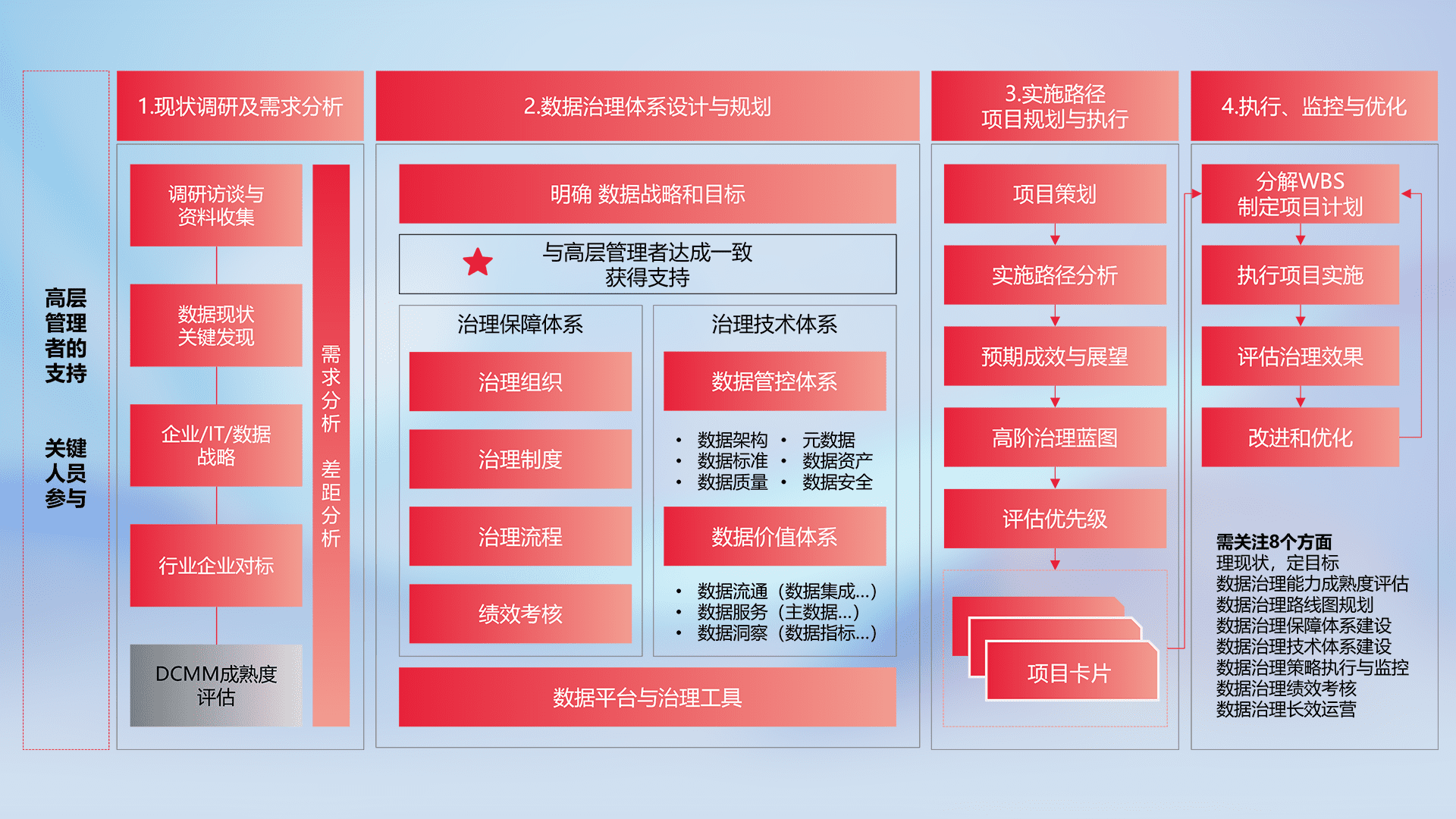制定并执行统一的数据标准,,,规范数据定义和格式,,,消除冗余和不一致性,,,实现跨部门和跨系统的数据一致性,,,,为企业提供标准化的数据基础。。。。